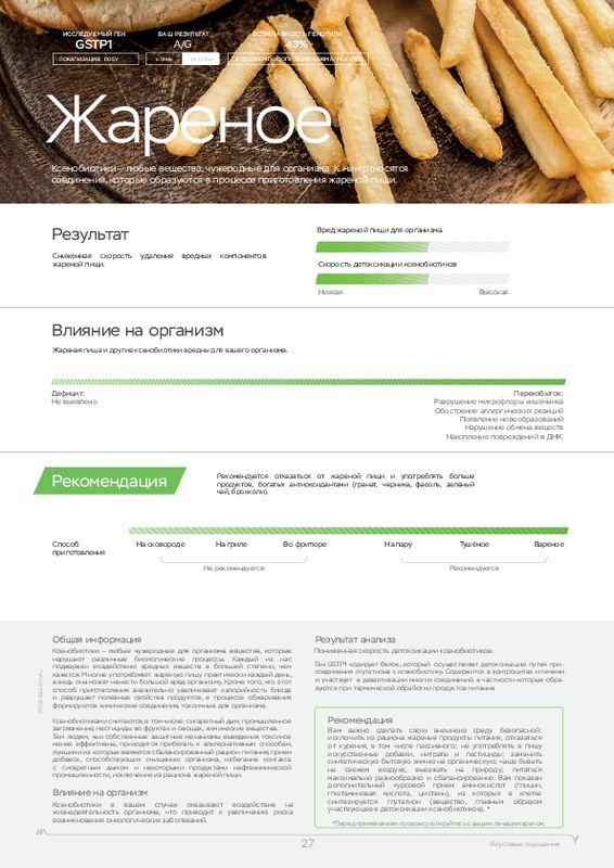 Этот ДНК анализ показывает, к каким физическим нагрузкам человек расположен генетически, а также какие продукты (содержащие определенные элементы) лучше употреблять в пищу. У каждого человека свои цели, кто-то хочет просто сбросить лишний вес, кто-то увеличить силу мышц, а кто-то нарастить огромные мускулы. Для получения максимальной отдачи от тренировок мы рекомендуем пройти наш генетический тест для фитнеса в Протвино.